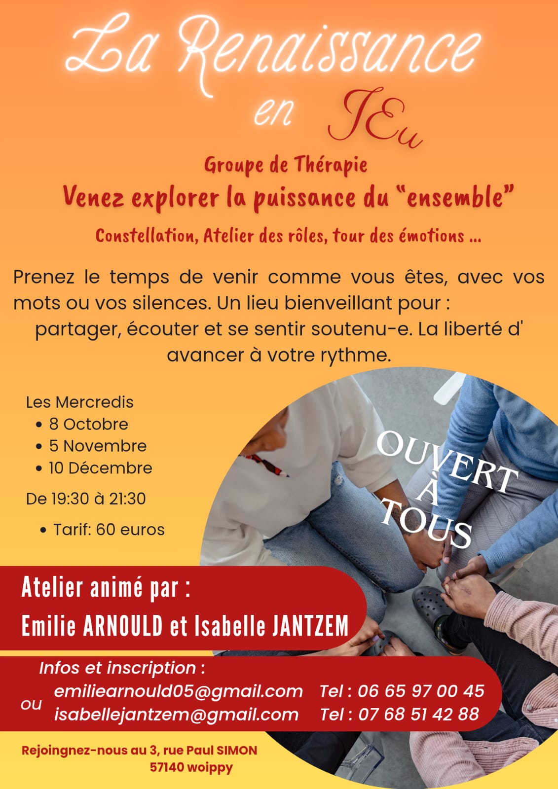 10 décembre - 19h30 > 21h30 La Renaissance en JEu – Séance 3 Salle SHANIA 3, Rue Paul Simon, Woippy, Moselle, France Groupe de Thérapie 60€